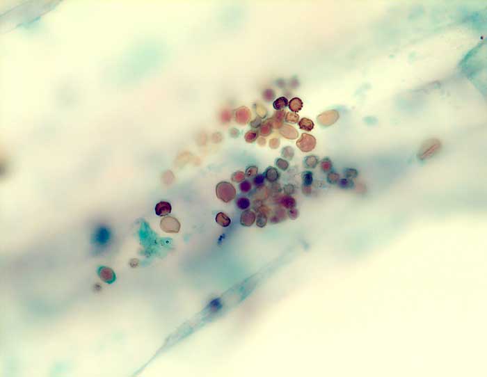 Gruppe von scheibchenförmigen etwa erythrozytengrossen Gebilde: Konidiosporen