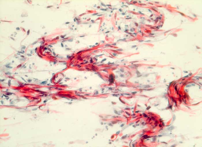 Sputum: atypische geschwänzte parakeratotische Zellen mit vergrösserten hyperchromatischen Kernen.