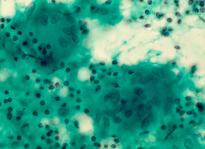 Feinnadelpunktat aus dem Bereich des linken Parotis-Unterpols: rein produktives epitheloidzelliges Granulom mit Riesenzelle vermischt mit Lymphozyten.