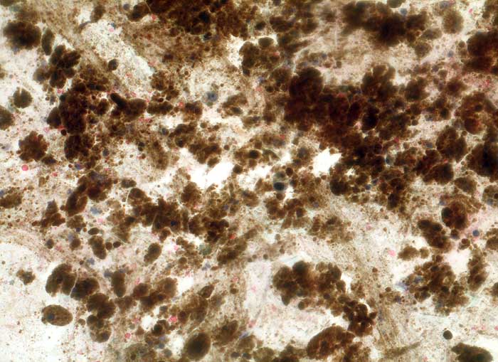 Bronchialsekret: Stark Melanin bildende Zellen. Das Melanin überdeckt die Tumorzellen vollständig.