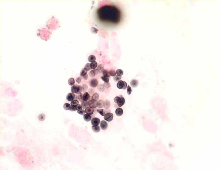 Bronchoalveoläre Lavage: Im Gegensatz zu Erythrozyten, die sich ebenfalls in einer Silberfärbung schwarz anfärben können, aber stets ein aufgehelltes Zentrum zeigen, ist die Einschluss-ähnliche Verdichtung im Zentrum der erythrozytengrossen Zystchen typisch für Pneumozysten.