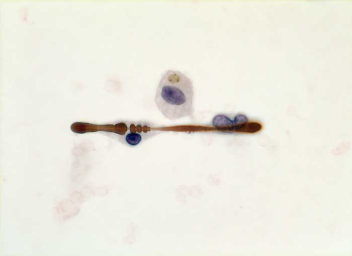 Ähnliche Körperchen werden auch durch andere faserförmige Staubkristalle hervorgerufen. Daher braucht man auch den Oberbegriff ferruginous bodies. Die sehr feingliedrigen Körperchen wie in diesem Fall sind aber recht typisch für asbestinduzierte ferruginous bodies. Zum Beweis der Asbestexposition empfiehlt sich eine mineralogische Staubanalyse.