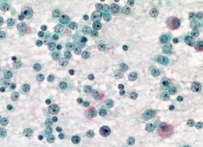 Feinnadelpunktat der Hypophyse: Diffuse Rasen gleichförmiger Zellen mit unterschiedlich grossen runden Kernen und gut sichtbarem basophilem Nukleolus. Darunter zahlreiche Nacktkerne. Wo erhalten, ist das Zytoplasma teils zyanophil, teils auch rötlich granuliert.