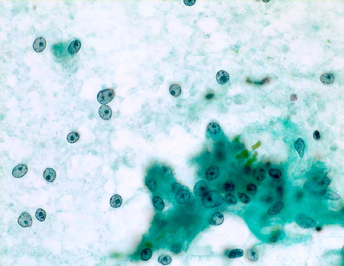Frischgewebsabstrich Leber: Trabekel von Tumorzellen mit vesikulären Kernen und Nachweis von Galleproduktion. Dissoziation mit nacktkernigen Einzelzellen.