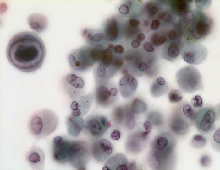 Kerneinschluss mit Halo (Eulenauge). Daneben Alveolarmakrophagen.
