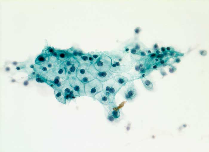 Bronchialsekret: Verband von kubischen Zellen mit rundlichen Kernen und scharf begrenztem, blasszyanophilem bis transparentem Zytoplasma. Die Kerngrösse variiert kaum. Die Kerne sind rund und enthalten einen oder mehrere plumpe Nukleolen.
