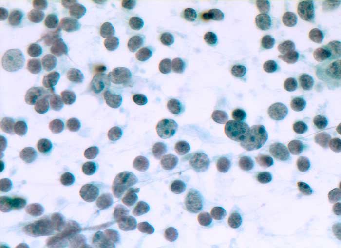 Feinnadelpunktion Lymphknoten zervikal: Der Ausstrich enthält reichlich Lymphozyten, darunter auffallend viele transformierte grosse Zellen aus Keimzentren (Zentroblasten) mit mehreren peripher lokalisierten Nukleolen.
