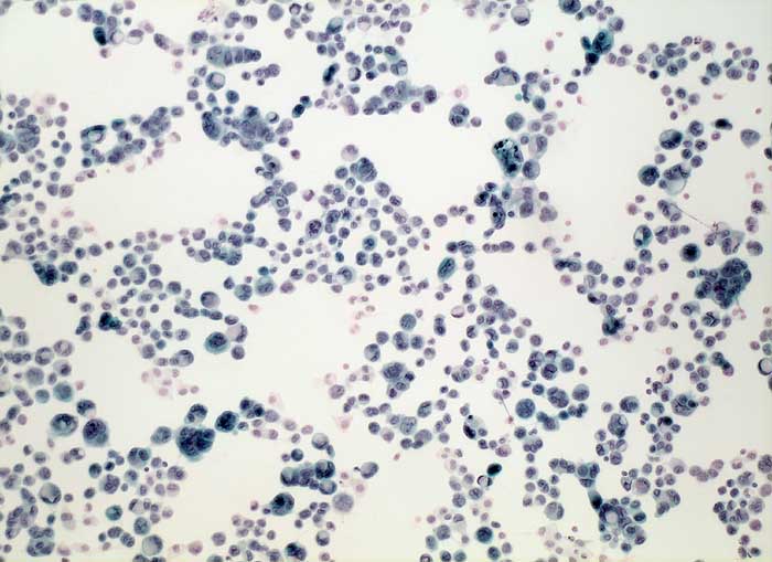 Zytologische Diagnose: Massenhaft Zellen eines Adenokarzinoms. Das Zellbild passt zu Metastasen des bereits bekannten Mammakarzinoms.