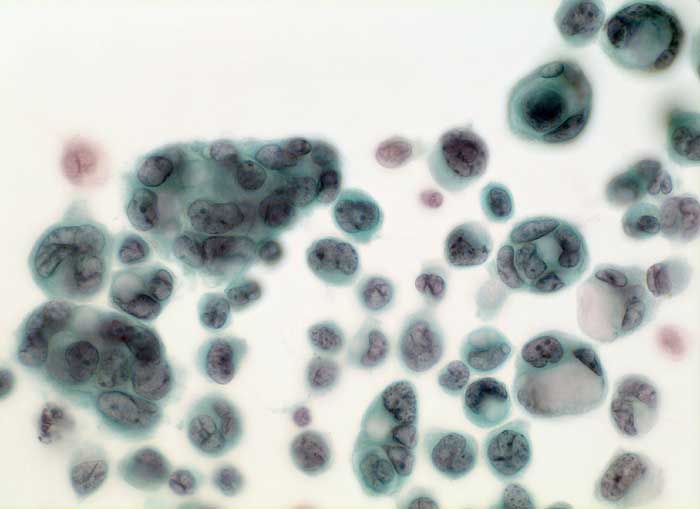 Aszitespunktat: Stark atypische Zellen in kleinen Gruppen und einzeln liegend. Ausgeprägte Kernpolymorphie, entrundete Kerne und Einkerbungen der
