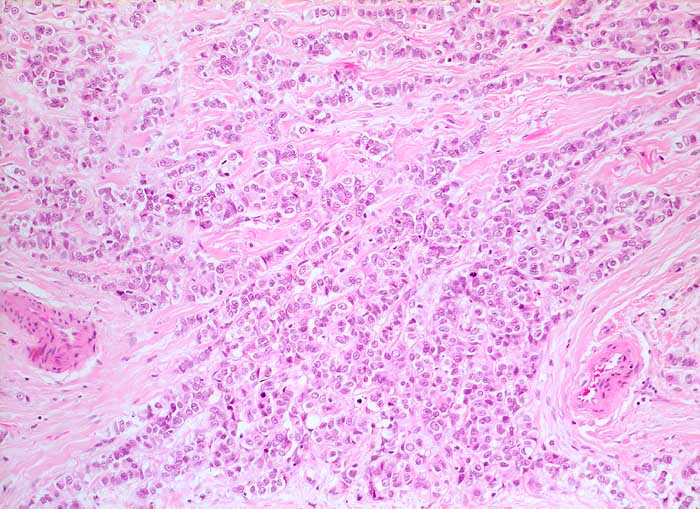 Die monomorphen Tumorzellen sind in Einerreihen angeordnet. Zwischen den Zellreihen desmoplastisches Stroma.
