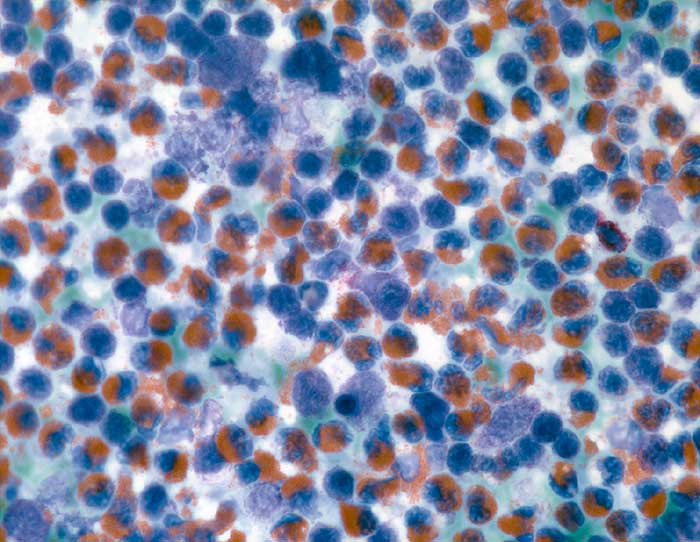 Pleurapunktat: Massive Vermehrung eosinophiler Granulozyten mit feingranuliertem rotem Zytoplasma und segmentierten rund-ovalen Kernen.