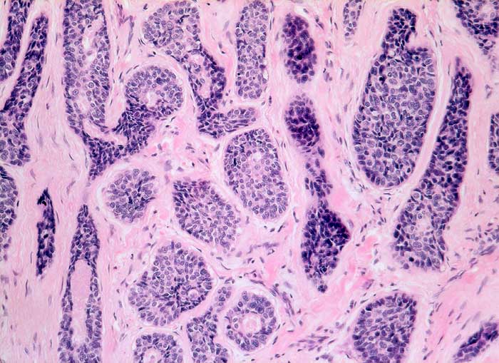 Solide, scharf begrenzte Zellstränge mit dichtgepackten zytoplasmaarmen monomorphen Zellen mit runden oder angulären Kernen. Dichtes Stroma umfliesst die Zellgruppen.