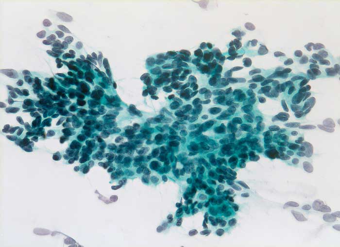 Feinnadelpunktion Parotis: Relativ gleichförmige zytoplasmaarme Tumorzellen mit ovalen oder angulären fein granulierten Kernen.
