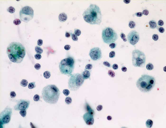 Pleuraerguss: kleine Lymphozyten mit manchmal leicht abnormen Kernen (wahrscheinlich therapie- oder entzündungsbedingt), viele vakuolisierte lipdidspeichernde und ganz vereinzelt pigmentspeichernde Makrophagen.