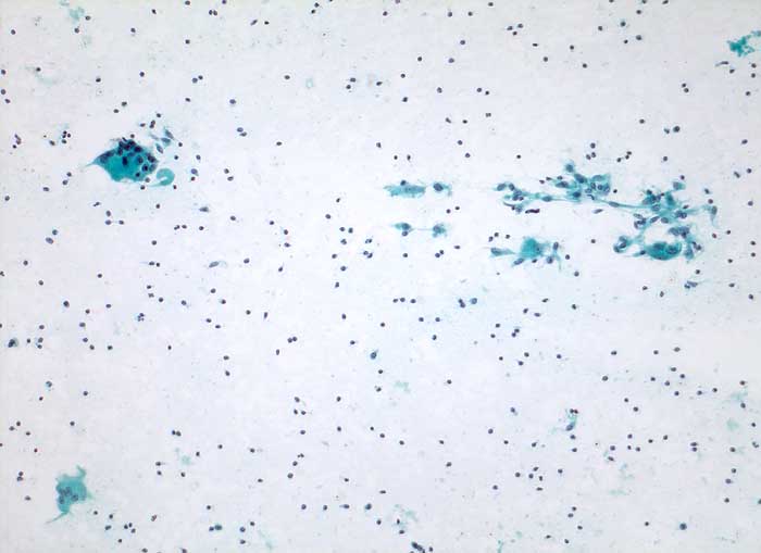 Feinnadelpunktion Schilddrüse: Neben einigen teils in granulomähnlicher Anordnung liegenden