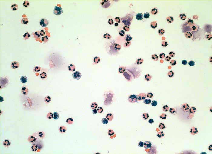 Liquor: zahlreiche neutrophile Granulozyten und einige Lymphozyten