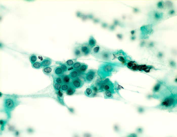 Portio: Plattenepithelzellen etwa so gross wie Basalzellen oder kleine Parabasalzellen. Der Zelleib ist abgerundet. Die Epithelien bilden einen lockeren Verband. Intensiv zyanophiles Zytoplasma. Runde Kerne mit fein granulärem Chromatin. Keine Vergrösserung der Nukleolen.