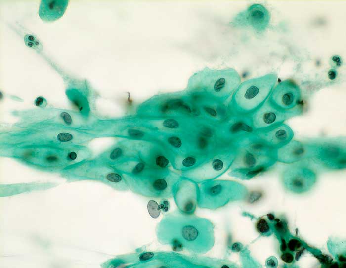 Portio: Mosaikähnlicher Verband von Plattenepithelzellen von der Grösse kleiner Intermediärzellen. Kerne rund bis ovalär mit fein granulärem regelmässig verteiltem Chromatin.