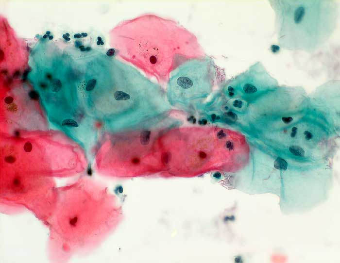 Portio: Superfizialzellen mit kleinen pyknotischen Kernen und Intermediärzellen mit deutlich grösseren Kernen. Zahlreiche stäbchenförmige Bakterien (Döderlein Flora) und einzelne neutrophile Granulozyten.