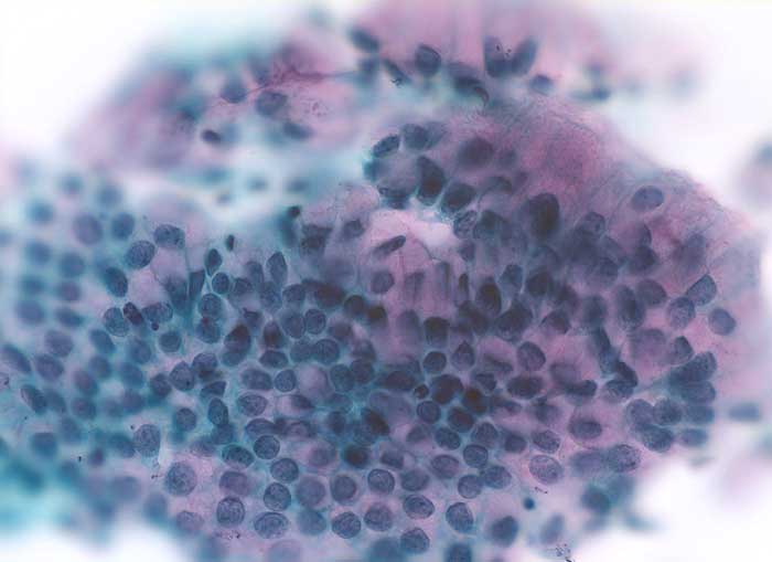 Zervixabstrich: regelmässiger honigwabenartiger Zellverband ohne Atypien. Die Zylinderzellen enthalten reichlich rosafarbenen Schleim.