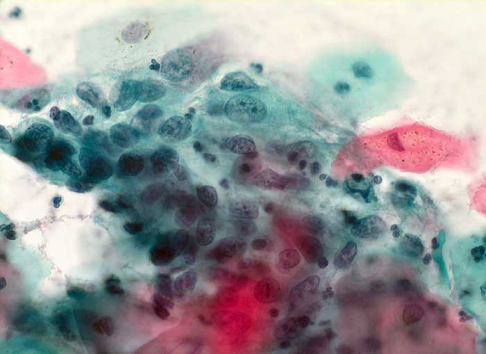 Portioabstrich: Plattenepithelien mit vergrösserten hyperchromatischen Kernen und erhöhter Kern-Plasmarelation