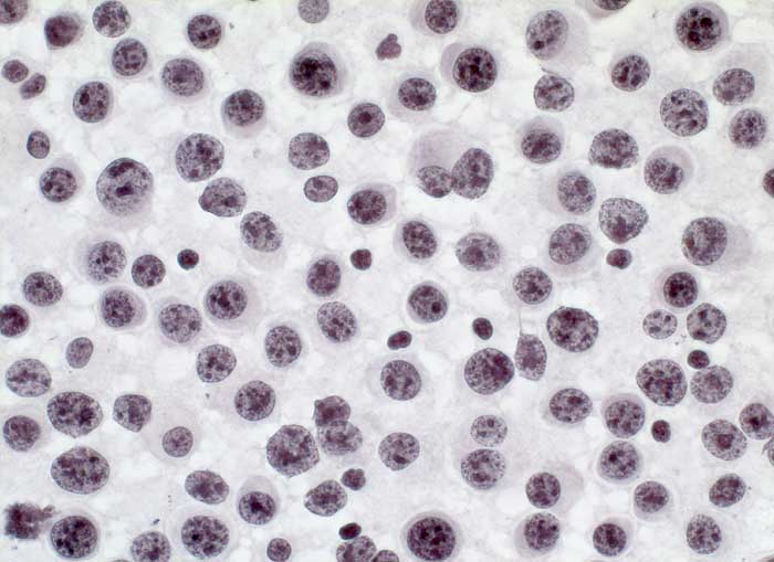 Immunzytochemisch sind die Tumorzellen negativ für den T-Linien-spezifischen Marker CD3 bei gleichzeitiger positiver interner Kontrolle in Form von eingestreuten kleinen reaktiven T-Zellen. Auch die Reaktion für den B-Zell-Marker CD20 ist negativ, dagegen reagieren sämtliche atypischen Zellen positiv für den Plasmazellmarker CD138 (Syndecan-1). Dieser Befund beweist zusammen mit dem zytomorphologischen Aspekt die Diagnose eines Plasmozytoms. Es dürfte sich mit hoher Wahrscheinlichkeit um ein extramedulläres Rezidiv des in einer früheren Knochenmarksbiopsie diagnostizierten, wenig differenzierten multiplen Myeloms (damals monoklonal positiv für Kappa-Leichtketten) handeln. Die Reaktion auf den Proliferationsmarker Ki-67 zeigt eine Positivität in ca. 80% der Tumorzellkerne, was auf eine ausgesprochen hohe proliferative Aktivität hinweist