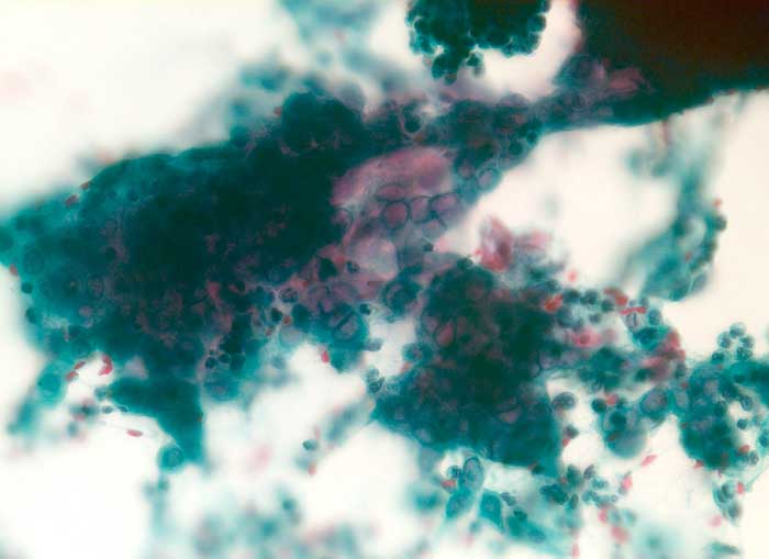 Riesenzellen mit Milchglaskernen. Granulozytär entzündliches Zellbild.
