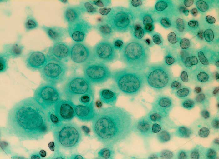 Aszites: Neben Makrophagen (rechts im Bild) finden sich Verbände grosser polygonaler Zellen mit runden vesikulären Kernen und Makronukleolen. Diese entsprechen reaktiv veränderten Mesothelzellen.