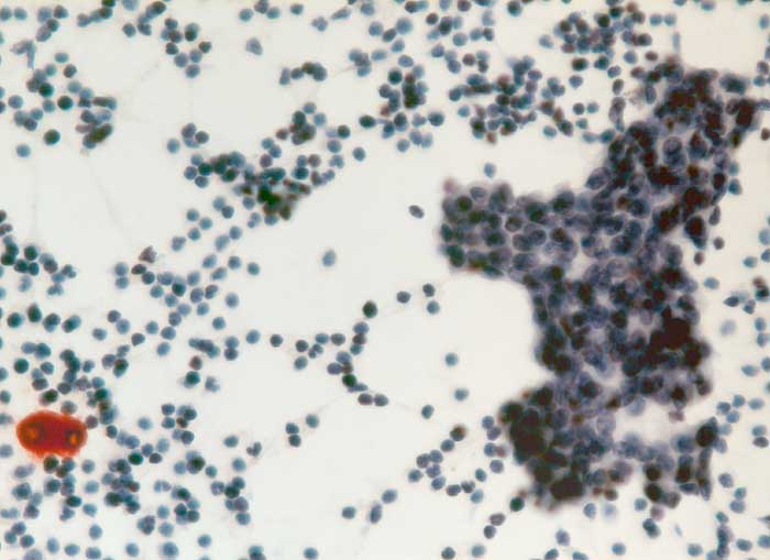 Immunzytochemisch sind die papilliformen Zellverbände deutlich positiv für den Epithelmarker Ber-EP4, dagegen negativ für den Mesothelmarker Calretinin. Demnach handelt es sich nicht um reaktive Mesothelproliferate, sondern um Karzinomzellen, vereinbar mit Metastasen des bekannten papillären Nierenzellkarzinoms.
