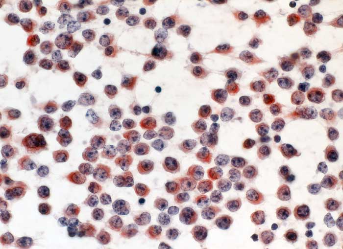 Immunzytochemisch sind die atypischen lymphoiden Zellen negativ für den T-Lymphozytenmarker CD3. Ca. 10% der Tumorzellen zeigen dagegen eine deutliche Positivität für den B-Lymphozytenmarker CD20. Somit handelt es sich um einen peritonealen Befall des in der Biopsie nachgewiesenen diffusen grosszelligen B-Zell-Lymphoms.