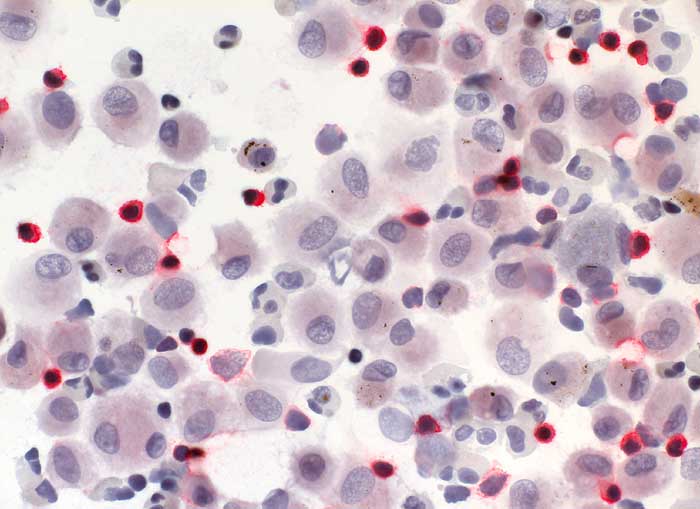 Bronchoalveoläre Lavage: zahlreiche Lymphozyten sind positiv für den T-Zell Marker CD8.