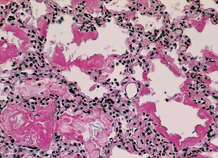 Mekonium in einzelnen Alveolarräumen. Die Alveolarsepten sind austapeziert von PAS positiven
