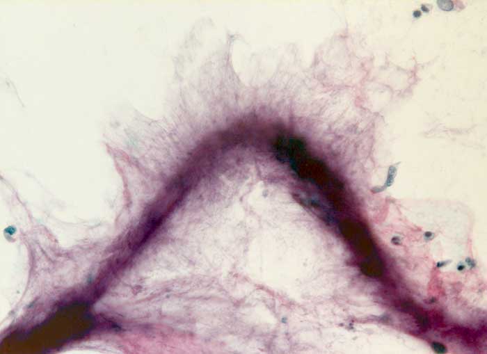 Spiralförmig gewundener Schleimfaden mit haarigen Ausläufern zu beiden Seiten.