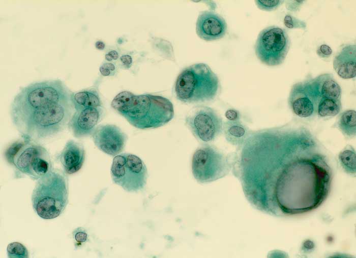 Pleuraerguss: Unterschiedlich grosse atypische Zellen mit grossen vesikulären, teils eingedellten oder eingekerbten Kernen. Heller Kernhintergrund. Grosser eosinophiler Nukleolus. Mässig breites, fein vakuolisiertes Zytoplasma.