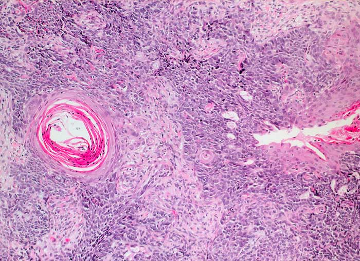 Der Tumor besteht überwiegend aus basaloiden kleinen zytoplasmaarmen Zellen. Der plattenepitheliale Charakter ist aber aufgrund der fokalen Verhornung gut erkennbar.