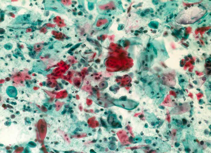 Portioabstrich: Vor einem teilweise detritischen Hintergrund finden sich über das ganze Präparat verteilt zahlreiche teils hochgradig atypische Plattenepithelien mit unterschiedlich grossen, teils polymorphen, hyperchromatischen Kernen. Nebst nicht verhornten atypischen Plattenepithelien mit schmalem uncharakteristisch zyanophilem Zytoplasmaleib und hoher Kernplasmarelation finden sich auch zahlreiche Zellen mit hellorangem, verhorntem Zytoplasma und teilweise hyperchromatischen und geschrumpften Kernen. Einige der verhornten Plattenepithelien zeigen ein kaulquappenartig länglich ausgezogenes Zytoplasma.