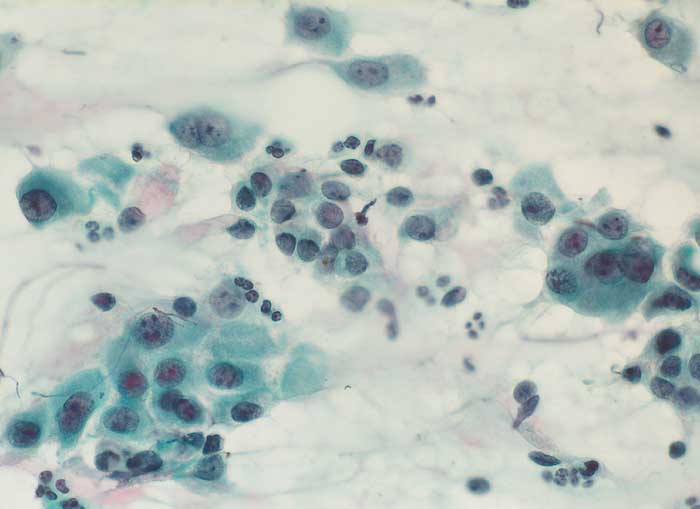 Portioabstrich: Verbände aus Zylinderzellen. Kerne vesikulär, gross, hell, leicht bis mässig polymorph. Chromatin granulär, Nukleolen vergrössert. Zytoplasma mittelbreit, uncharakteristisch, teils mit Schleimbildung. Keine schweren Atypien. Mässig viele Granulozyten. Hintergrund sauber.