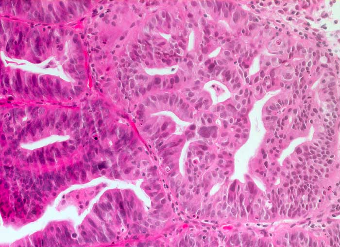Das Karzinom bildet komplexe kribriforme Strukturen, aber keine soliden Tumorkomplexe. Die Zellatypien sind leicht bis mässig ausgeprägt.