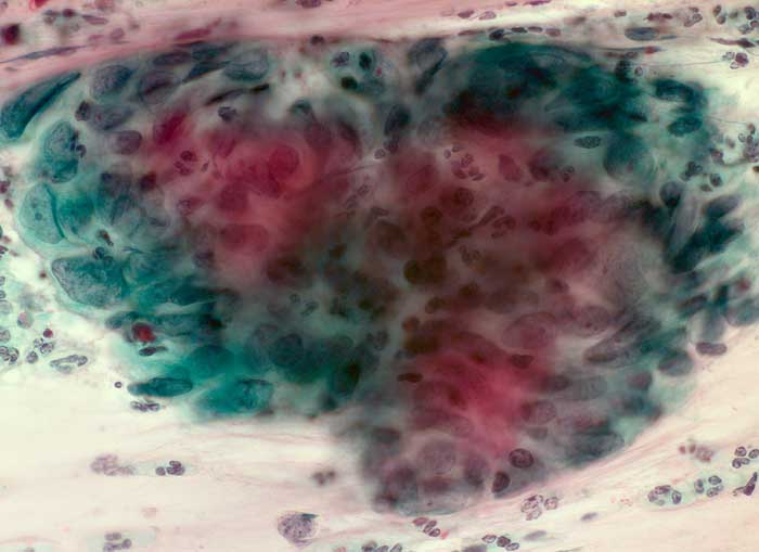 Zervixabstrich: Verband schleimbildender zervikaler Zylinderzellen. Kerne mässig vergrössert, leicht polymorph und entrundet. Einzelne leicht vergrösserte Nukleolen. Im Hintergrund neutrophile Granulozyten.