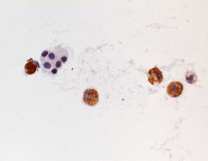 Ovar, Zystenpunktat: Die Makrophagen sind positiv für CD68. Die CD68 negativen Zystenepithelien sind deutlich kleiner und haben regelmässige runde kondensierte Kerne.