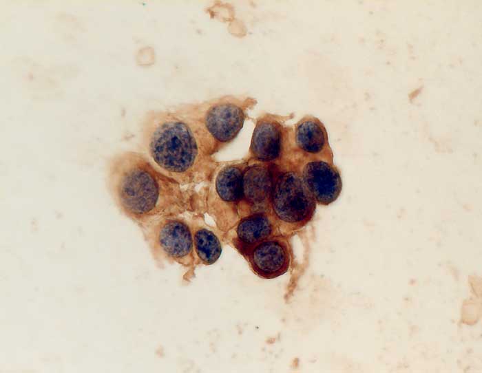 Feinnadelpunktat der Hypophyse: Die hypophysären Zellen mit erhaltenem Zytoplasma sind alle positiv für Prolaktin.