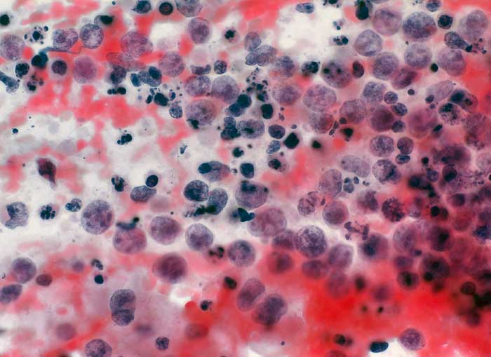 Zytoplasma ist als dünner Saum nur andeutungsweise zu sehen. Zahlreiche Kerntrümmer von $o{ag36060Apoptose} apoptotischen Tumorzellen.