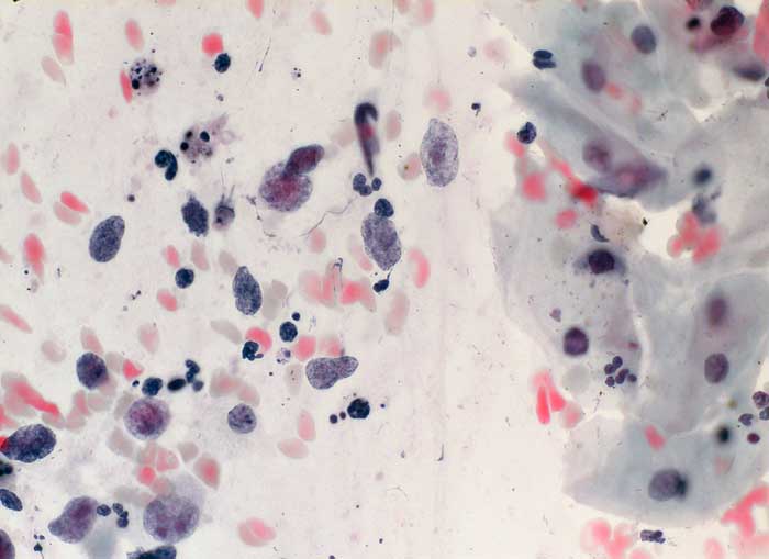 Portioabstrich: Links im Bild atypische nacktkernige einzeln liegende Lymphomzellen und Apoptosen. Rechts im Bild Plattenepithelien vom intermediären Typ.