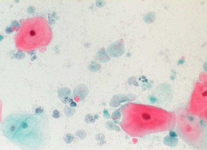 Birnenförmige zyanophile Trichomonaden mit eosinophilen Granula im Zytoplasma und exzentrischem transparentem Kern. Intermediärzellen.