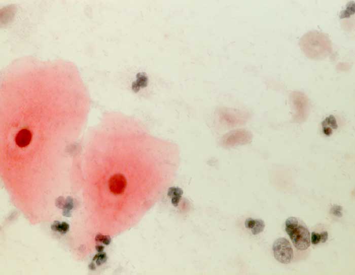 Trichomonaden mit eosinophilen Granula im Zytoplasma und exzentrischem transparentem Kern. Intermediäre Zellen.