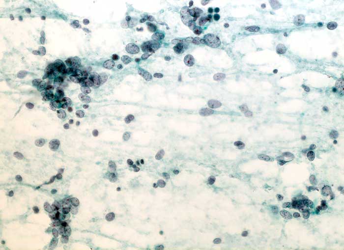 Uterus, Frischgewebsausstriche: Zahlreiche vielfach nacktkernige Zellen eines teils spindelzelligen malignen Tumors. Die Spindelzellen sind sehr unterschiedlich gross. Die Kerne sind längsoval, hyperchromatisch und weisen einen oder mehrere Nukleolen auf. Die Zellen liegen einzeln oder zu kleinen Gruppen zusammengeballt. Detritischer Hintergrund.