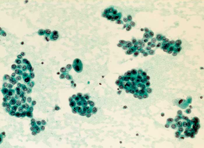 Pleurapunktat: Zahlreiche meist kugelige Verbände von atypischen Zellen. Die Zellen erinnern etwas an normale Pleuramesothelien, besitzen aber vergrösserte und teilweise auch leicht deformierte Kerne, wobei auch eine mässige Kerngrössenvariabilität auffällt. Das Kernchromatin leicht vergröbert. Ein bis mehrere, teils gut sichtbare Nukleolen. Zytoplasma schmal bis mässig breit, abgerundet und uncharakteristisch zyanophil. Häufige Mitosen.