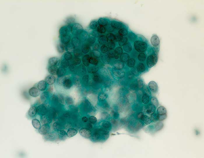 Bronchialsekret: Dichter Verband von regelmässig gelagerten Zylinderepithelien mit unterschiedlich grossen, leicht hyperchromatischen Kernen und deutlich erkennbaren Nukleolen. Die vereinzelt erkennbaren Flimmerhaare erlauben die Diagnose von Bronchialepithelien mit reaktiven Veränderungen.