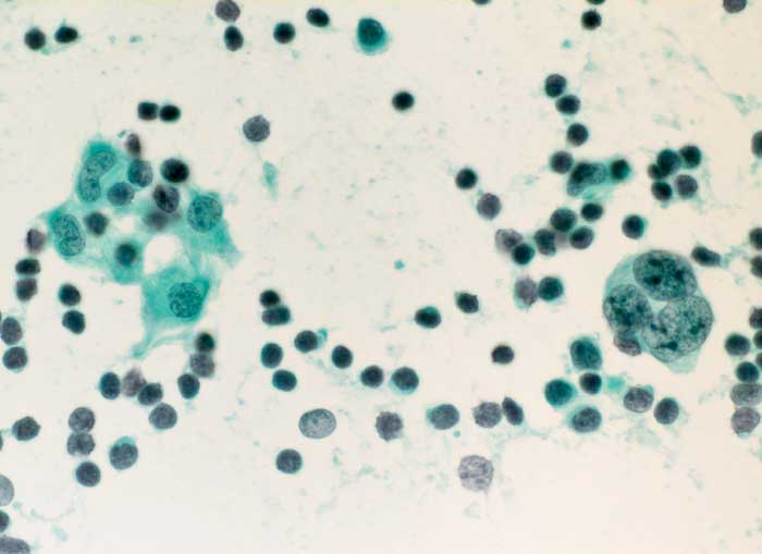 Zytologische Diagnose: Gemischtzelliges lymphozytäres Zellbild mit einigen teils doppelkernigen atypischen blastären Zellen, vereinbar mit Morbus Hodgkin (am ehesten gemischtzelliger Typ).