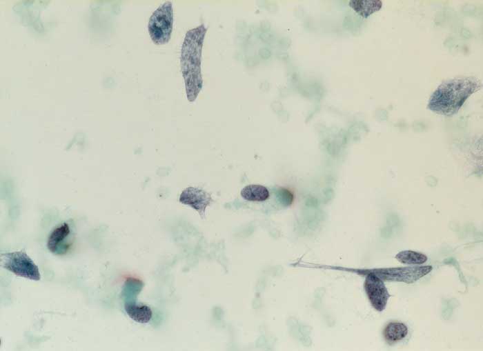 atypischen Zellen sind zum Teil spindelig. Die fragilen Kerne zeigen ein Pfeffer und Salz Chromatin. Die